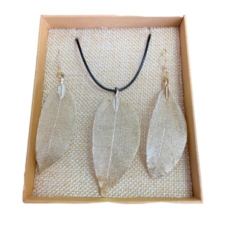 Conjunto artesanal con flores naturales prensadas encapsuladas en resina con el motivo “Árbol de la Vida”.